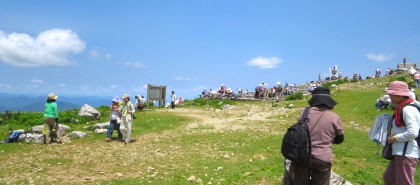 | 石灰岩のこぶし大くらいの石ころの多い山道を登り山頂近く、振り向けば左後方にまだ登山者が続いていました。 |